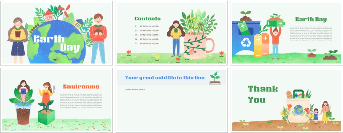 지구의 날을 주제로 제작된 파워포인트 배경 템플릿입니다. 지구 환경 보호 관련 일러스트 이미지가 포함되어 있어 활용하기 좋은 템플릿입니다. 6장의 슬라이드로 표지, 목차, 내지, 종지로 서비스 되고 있습니다.