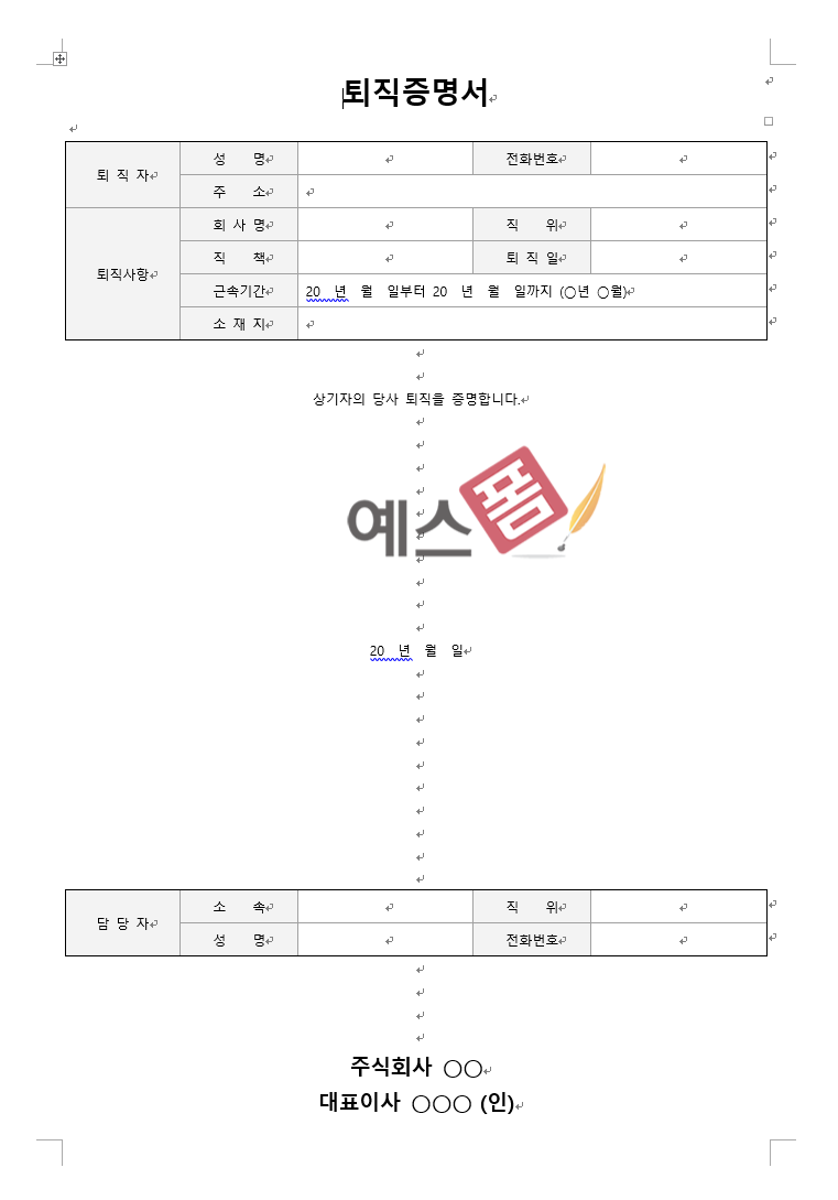 퇴직은 끝이 아니라 새로운 시작입니다. 명확하고 신뢰도 높은 퇴직증명서 한 장이 다음 경력의 시작을 더욱 든든하게 만들어 줍니다. 예스폼에서는 퇴직증명서를 포함한 각종 업무서식을 무료 또는 회원 전용으로 다양하게 제공하고 있으며, 문서 완성도를 높이는 실무 포맷으로 누구나 쉽게 작성할 수 있습니다. 지금 바로 예스폼에 방문하여, 상황에 맞는 퇴직증명서 양식을 다운로드하고 다음 단계를 스마트하게 준비해보세요!