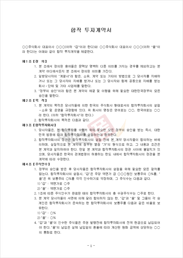 정의, 목적, 합작투자회사, 주식인수, 비용, 주식의 양도, 신주인수권 등을 기입하여 합작 투자 의향서 작성시 사용하는 의향서 양식입니다. 제 1 조【 정 의 】 제 2 조【 목 적 】 제 3 조【 합작