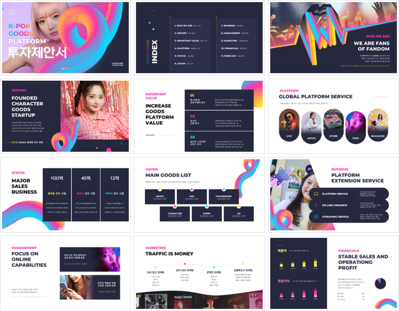 케이팝 굿즈 플랫폼 투자제안서에 대해 기술한 샘플자료입니다. 소규모 굿즈 사업을 플랫폼 사업으로 확장하여 엔터, 캐릭터 그외 각종 굿즈 사업을 하나의 앱으로 통합하는 투자제안서 요약 자료입니다.
