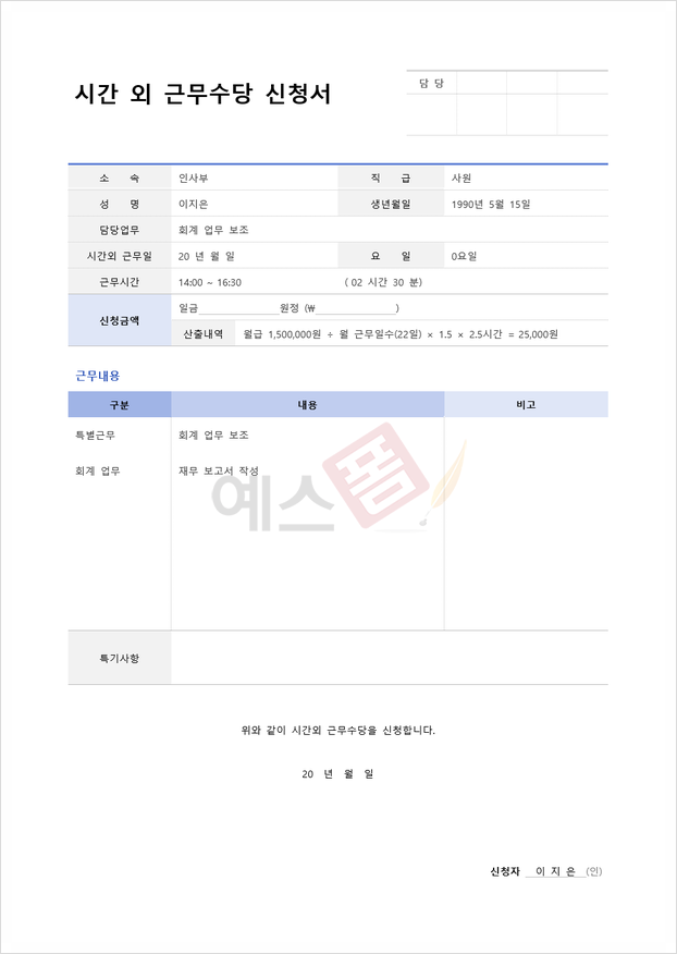 시간 외 근무수당 신청서(근무내용 및 금액)