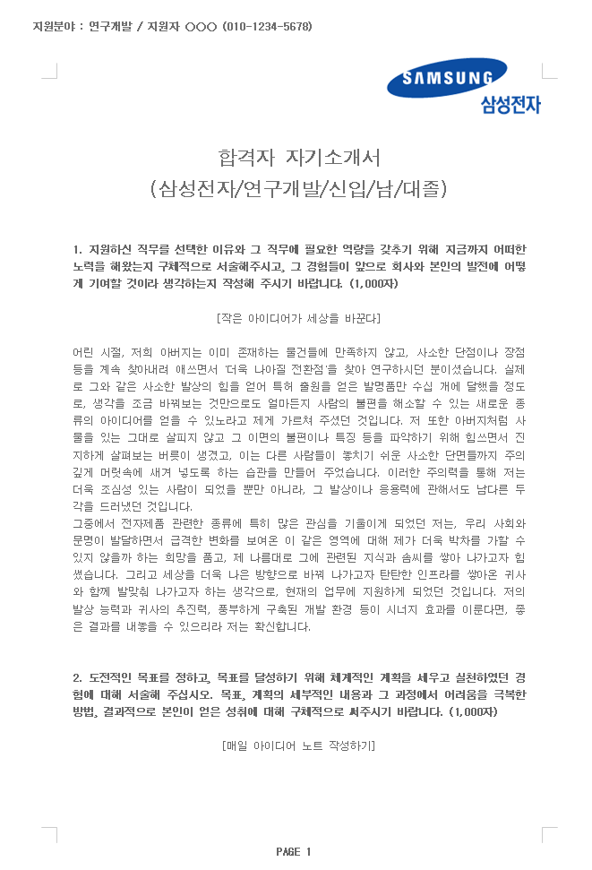 삼성전자 합격자 자기소개서 샘플입니다. 연구개발 지원, 4년대 대학교를 졸업한 신입사원 자기소개서 샘플입니다.
