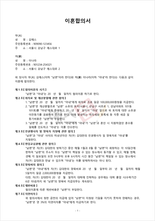 | 이혼 합의에 관한 합의사항을 명확하게 기재하고자 할 때 사용되는 이혼 합의서 양식입니다. 이혼의 시기, 위자료 및 재산분할, 친권 및 양육자 지정, 면접교섭권 등을 명시할 수 있습니다. 특정 부부의 이혼 합의가 예시로 포함되어 있습니다. |