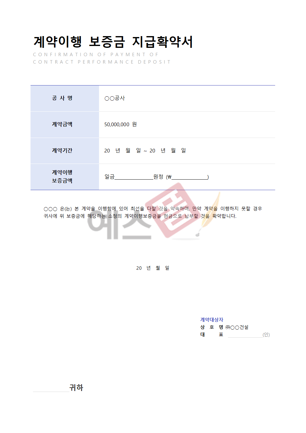 | 계약이행 보증금 지급확약서(공사) | 물품 매도 확약서(수출용 원자재) |