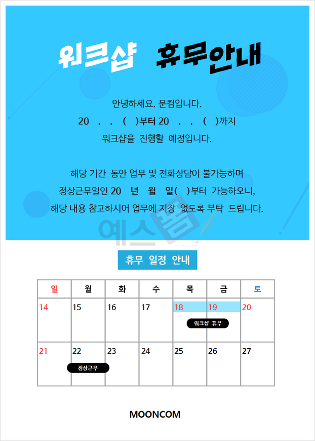 체육대회, 워크숍 일정과 장소가 정해지면 사내 공지를 통해 참가하시는 직원분들께 행사 내용을 공유하실 텐데요. 행사를 주말이 아니라 평일에 진행하게 되는 경우, 휴무 안내문으로 고객분들에게 행사일에 임시휴무를 하게 되었다는 사실을 알리시기 바랍니다.