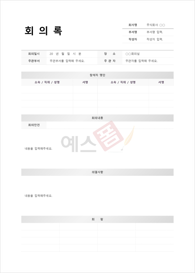 | 회의록 (기본형) | 회의록 (의결사항 및 회람) | 회의록 (참석자 서명) |