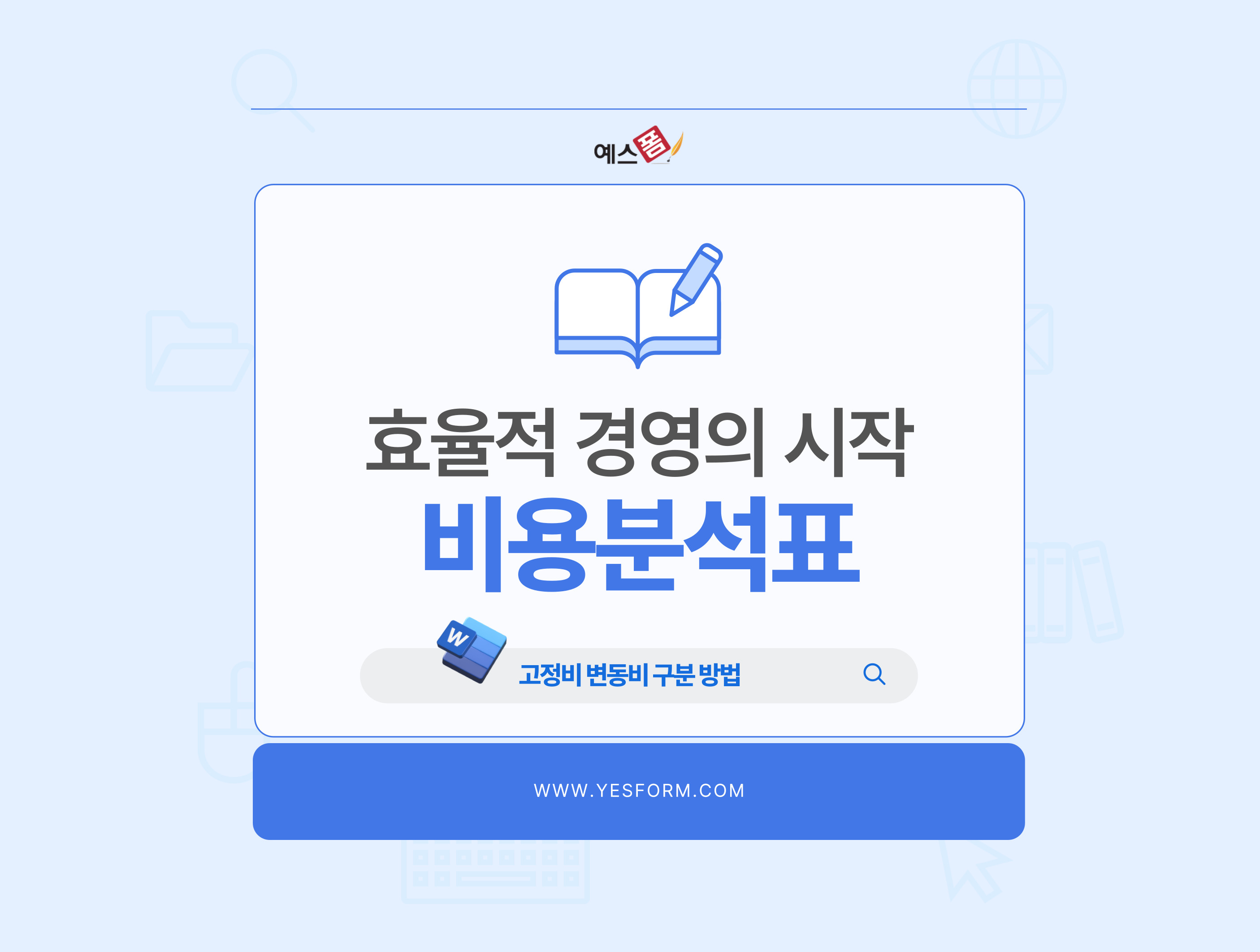 비용 관리는 기업 경영에서 빼놓을 수 없는 중요한 요소입니다. 비용분석표를 활용하면 회사가 어디에 얼마나 비용을 쓰고 있는지 한눈에 파악할 수 있는데요. 고정비와 변동비를 정확하게 구분해 분석하면 불필요한 지출을 줄여 효율적인 경영이 가능합니다. 이번 포스팅에서는 비용분석표의 뜻, 고정비와 변동비를 구분하는 방법에 대해 자세히 알아볼 예정입니다. 추가로 예스폼에서 업데이트된 비용분석표 양식 모음 추천을 드릴 예정이니 우리 회사의 비용 구조를 정확히 파악하고 싶은 분들은 끝까지 참고해 보시기 바랍니다.