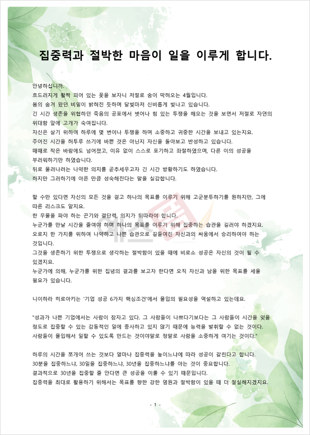 4월 봄인사말 팀장 팀원 안부인사말 2023년 입니다. 집중력과 절박한 마음이 일을 이루게 한다는 내용의 팀장 4월 봄 인사말입니다.