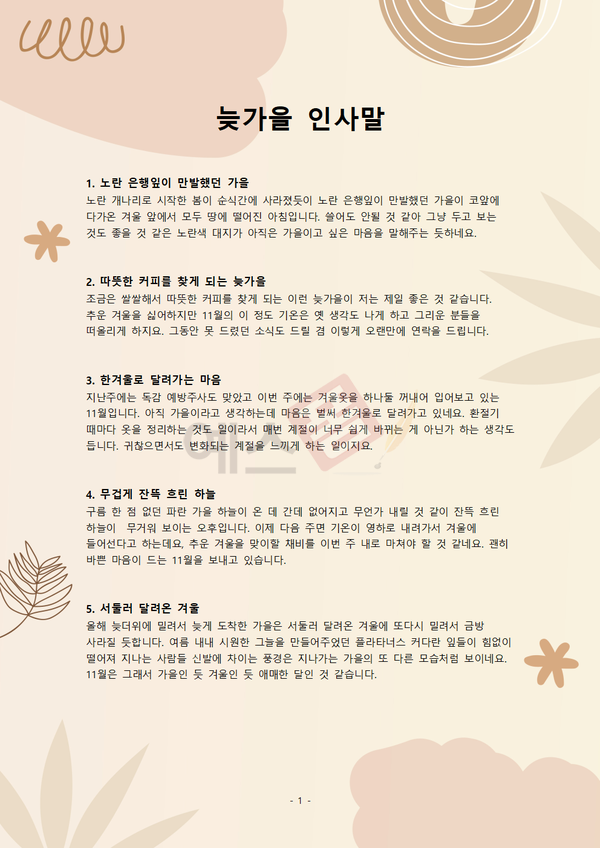| 11월 인사말 예문 | 늦가을 인사말 예문 | 초겨울 인사말 예문 |