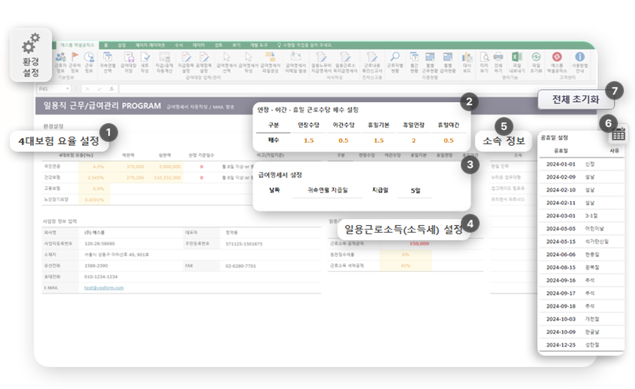 | SHEET 01 | 환경설정 | 4대보험 요율, 연장 · 야간 · 휴일 근로 수당 배수, 소득세, 공휴일 설정 |