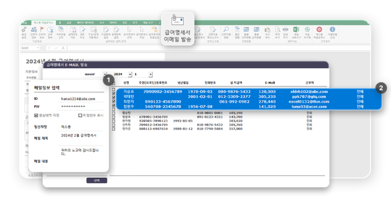 근로자별 급여명세서 자동작성, 급여명세서 이메일 발송 기능 (엑셀공작소에서 E-mail 발송 기능 추가 시)