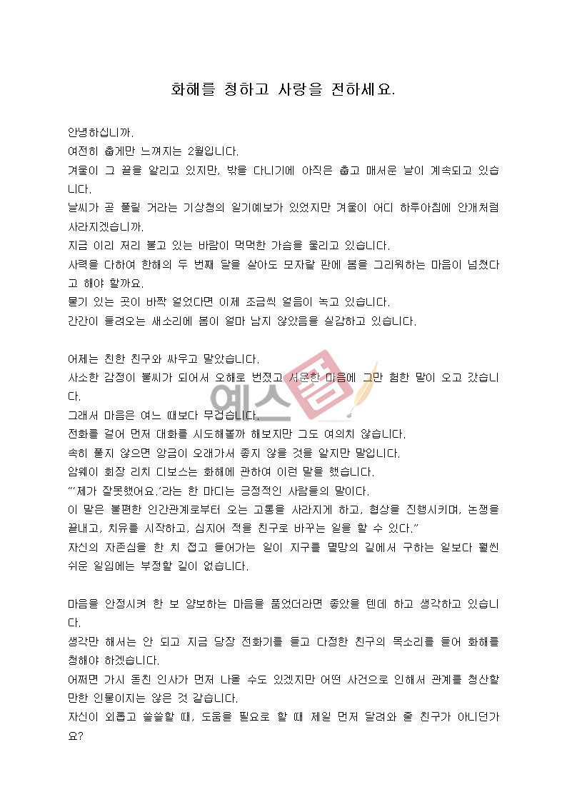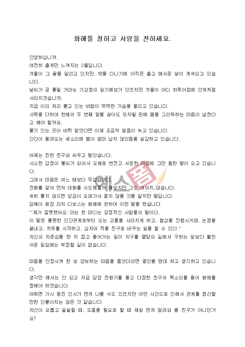 "추운 겨울이 지나고 어느덧 2월이 되었네요. 아직 쌀쌀하지만 봄을 기다리는 마음으로 건강 잘 챙기시고, 따뜻한 한 달 보내세요. 사랑합니다."