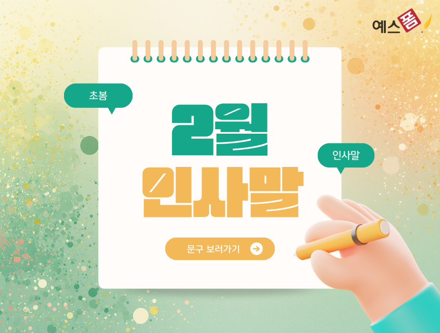 겨울이 지나고 봄이 오는 2월, 예스폼의 검증된 인사말 양식으로 더욱 따뜻하고 의미 있는 소통을 시작해보세요. 비즈니스 메일부터 개인 문자까지, 모든 상황에 맞는 완벽한 인사말이 준비되어 있습니다. 지금 바로 예스폼에 방문하셔서 2월 인사말 양식을 다운로드하고, 소중한 사람들에게 봄을 기다리는 설렘과 함께 따뜻한 인사를 전해보시길 바랍니다! 🌸