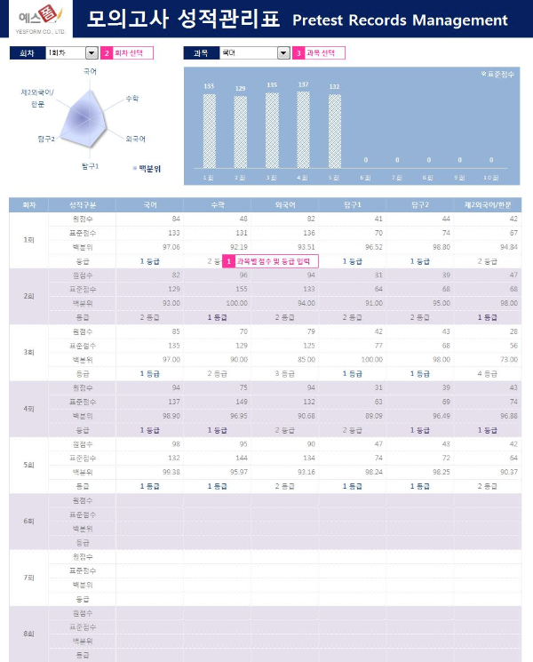 우선 세로형은 회차에 따른 과목별 원점수와 표준점수, 백분위, 등급을 입력할 수 있으며, 회차를 선택하여 선택한 회차의 과목별 백분위를 차트로 간편하게 확인하실 수 있습니다. 또한 과목을 선택하여 선택한 과목의 회차별 점수를 차트로 쉽게 확인할 수 있습니다.