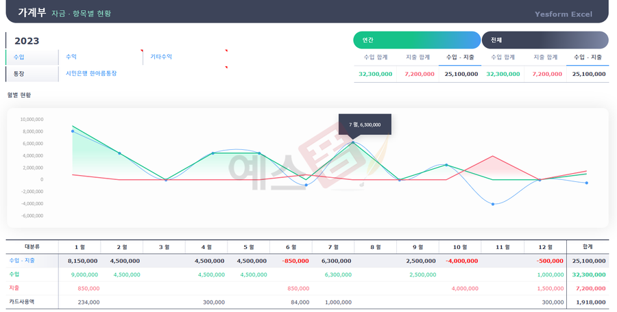 - 연도/구분(수입,지출)/결제구분(현금, 통장, 카드) 선택 시 자금·항목별 현황이 표시됩니다.