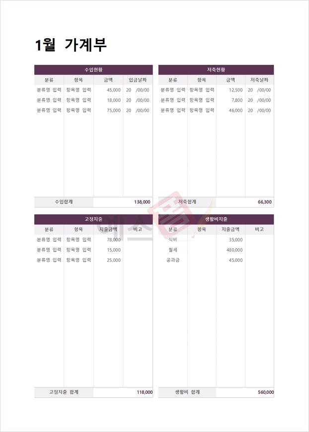 월간 가계부 (총 자산 표시) | 차량 가계부 (운행비용) | 월간 가계부 (표준 형식) |