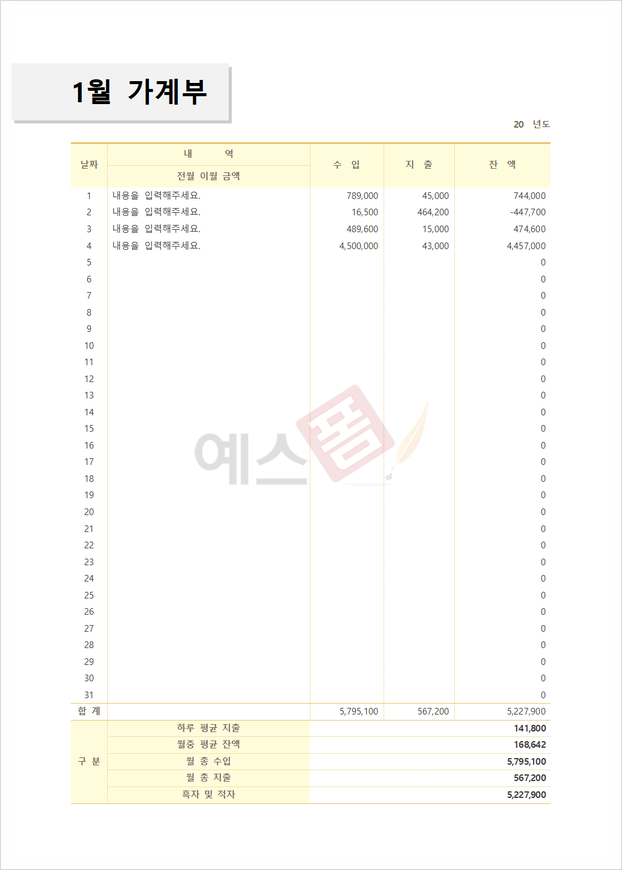 가계부 관리대장 - 예스폼 엑셀서식