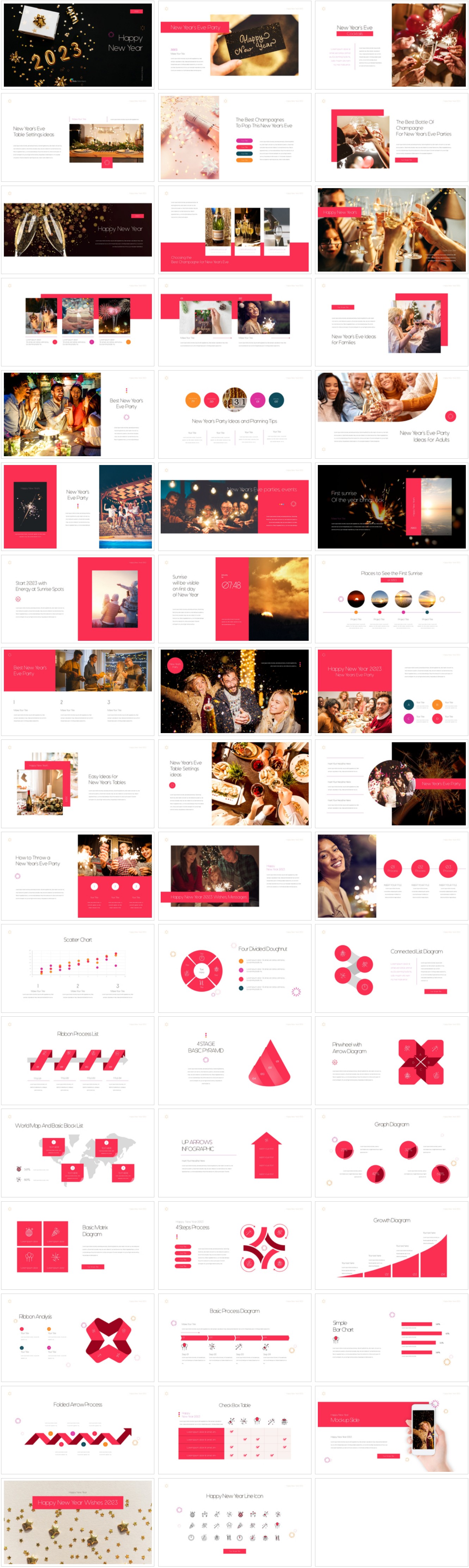 새해 전날 파티와 즐거운 느낌으로 살려 제작된 템플릿이며 총 50장의 슬라이드로 구성되어 있습니다. 눈에 띄는 포인트 컬러와 함께 고급스러운 느낌으로 디자인 되었으며, 컬러 차트로 손쉽게 템플릿 컬러 변경이 가능합니다.