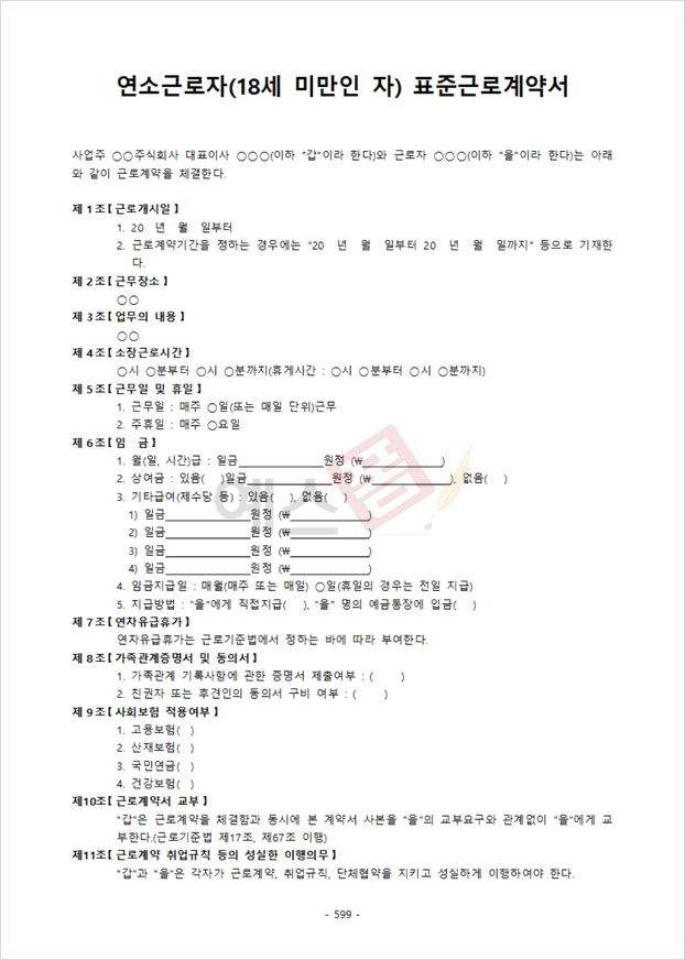 노동현장에서 서면 및 전자문서 근로계약 원칙을 확산 정착시키고, 근로계약서를 체결하는 데 있어 근로기준법 제17조에 필수적으로 기재해야 하는 근로조건이 누락되지 않도록 작성된 표준 근로계약서 양식입니다.