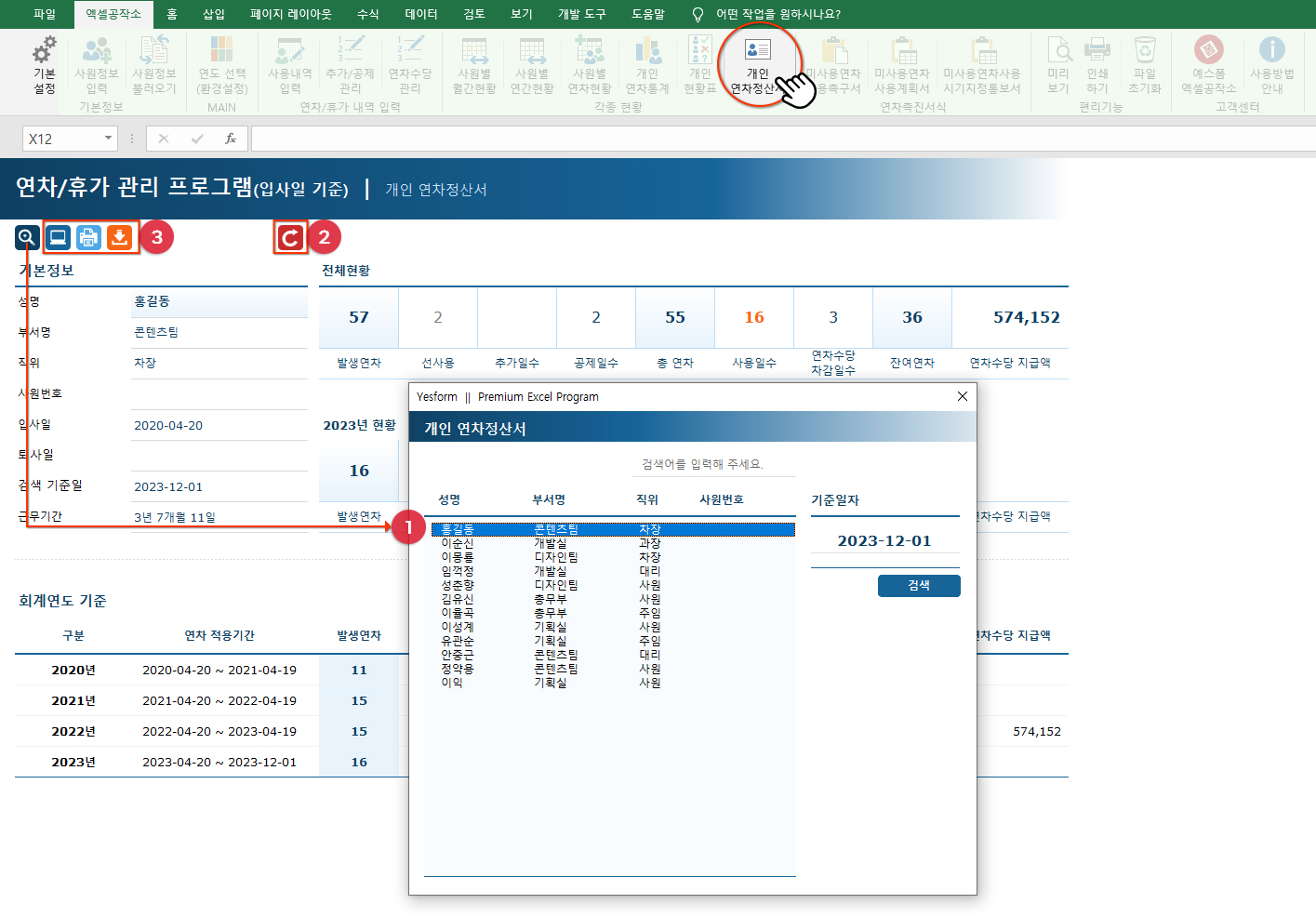 | SHEET 12 개인 연차정산서 | 기준일자별 개인(누적) 연차정산서 제공, 인쇄/미리보기, 파일 내보내기 제공 |