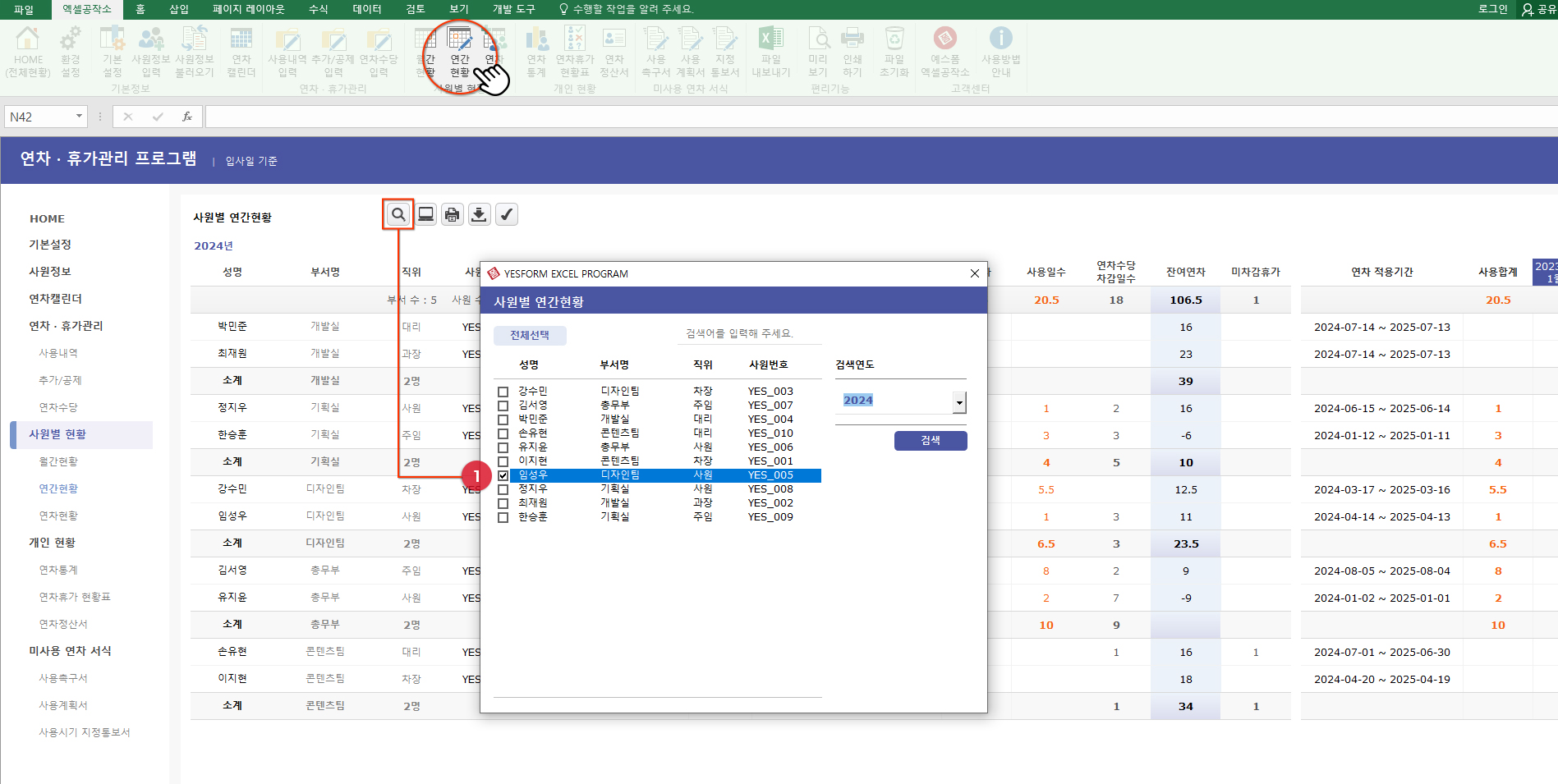 1️⃣ 돋보기 버튼 클릭 후, 사원, 검색연도를 선택하여 조회할 수 있습니다.