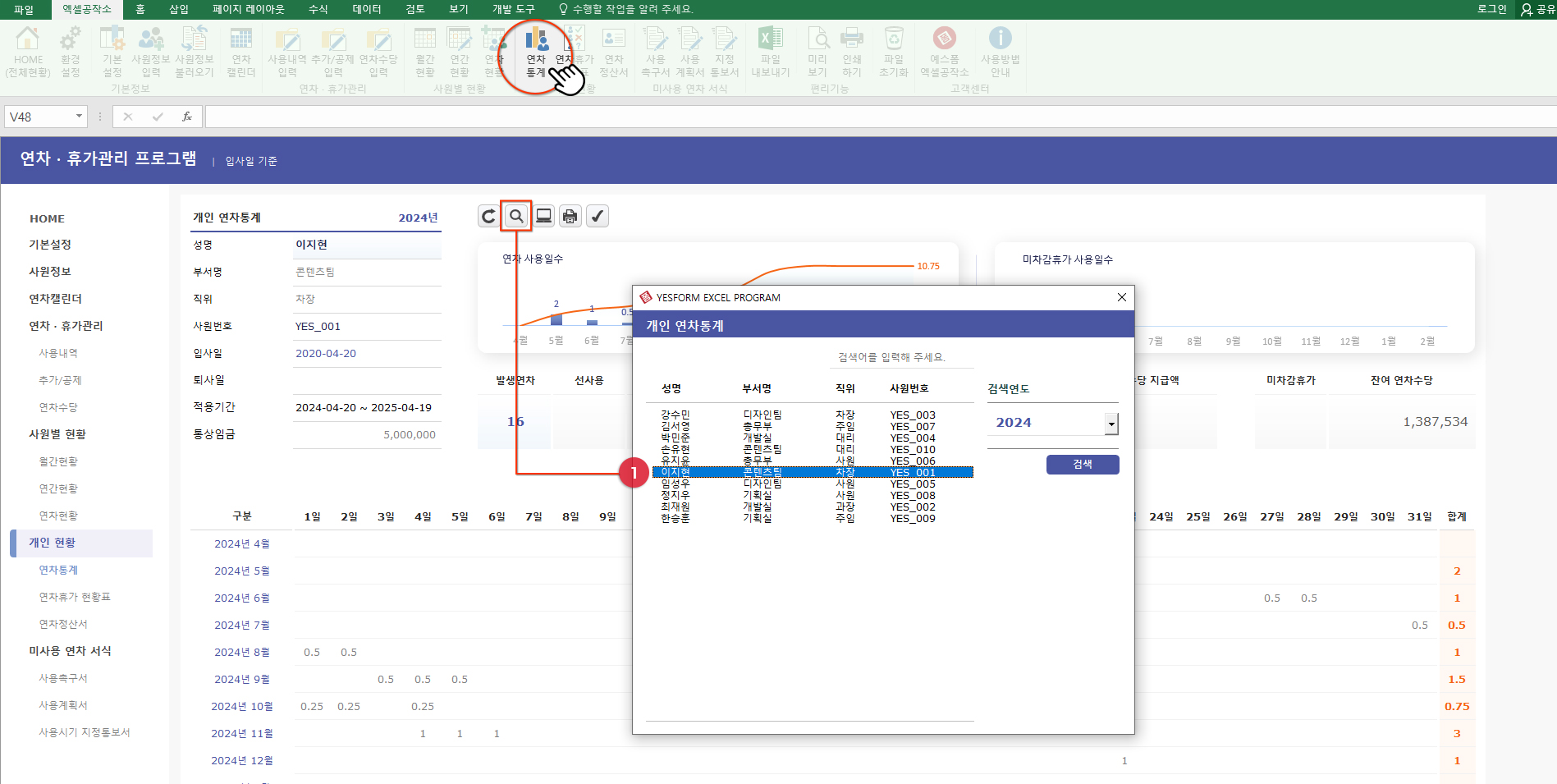 엑셀공작소 메뉴탭 - [개인 연차정산서]를 클릭합니다.