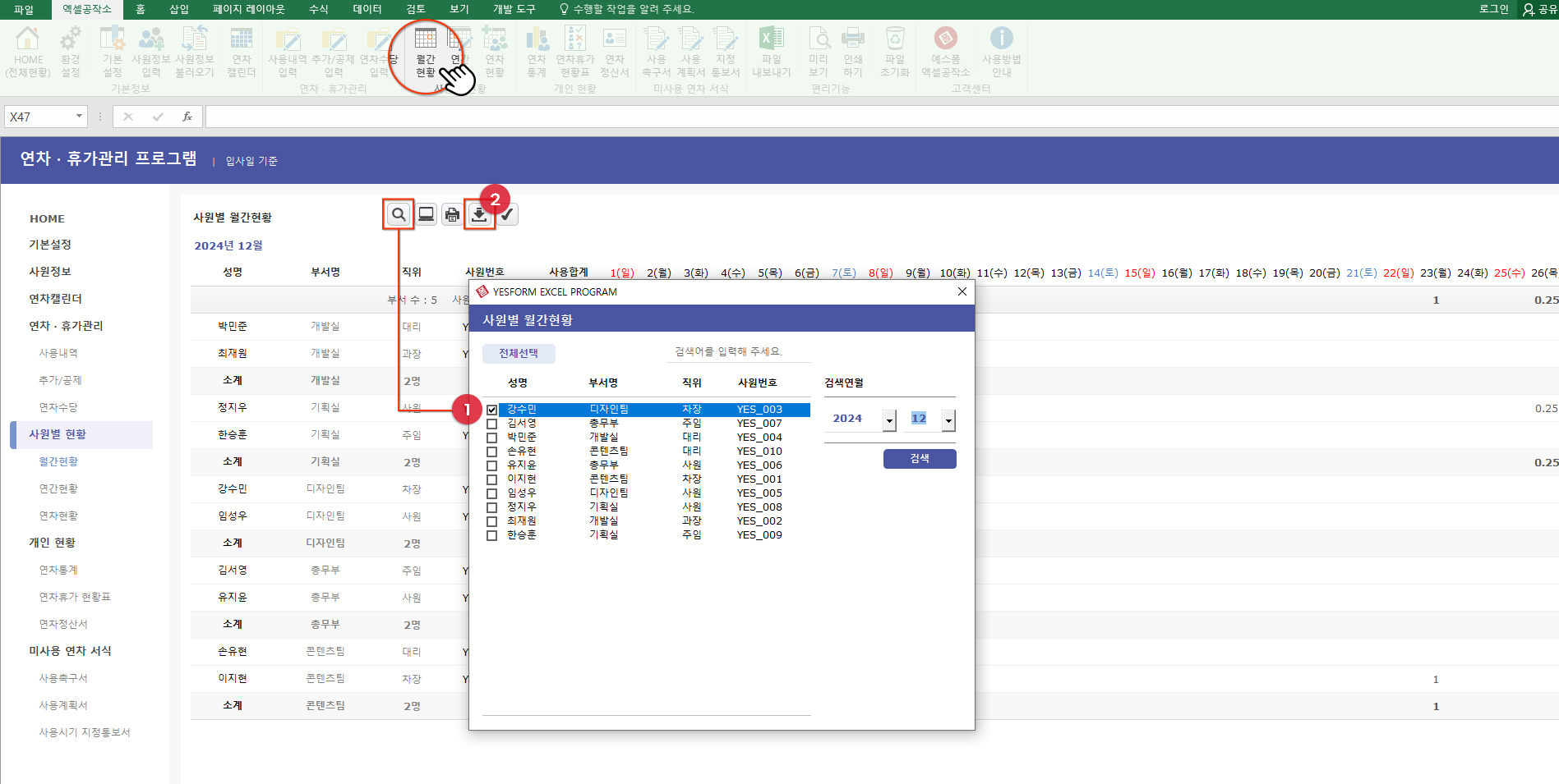 SHEET 08 사원별 월간현황 | 사원별/부서별 월간 연차 사용현황 확인, 인쇄/미리보기, 파일 내보내기 제공 |
