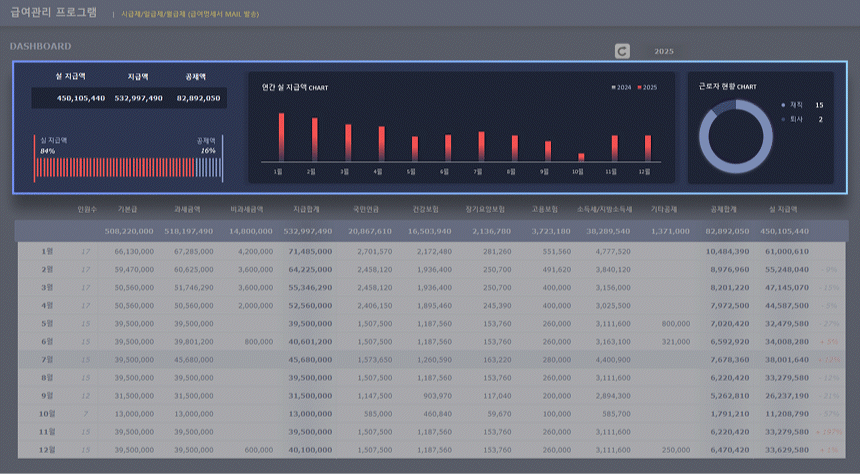 연간(1월~12월) 급여 지급 현황을 직관적인 차트로 보여줍니다. 월별 총 급여액, 실 지급액 추이를 한눈에 파악할 수 있으며, 전년도와 비교하는 차트도 제공됩니다. 현금과 계좌 잔액 비율, 근로자 현황 등도 시각화되어 있어, 경영 보고서 작성 시 바로 활용할 수 있습니다.