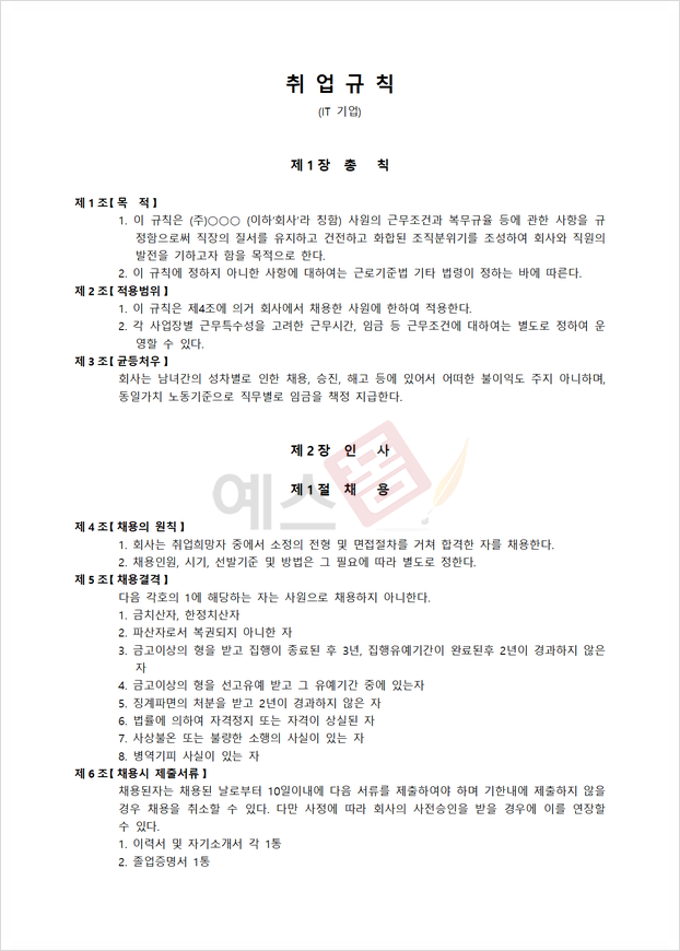 예스폼 표준 취업규칙 양식 예시