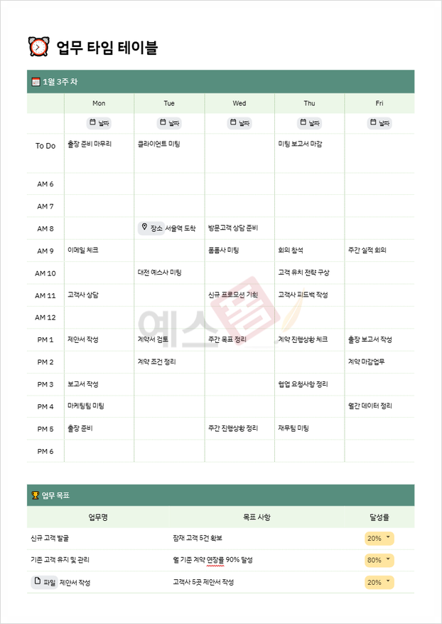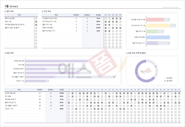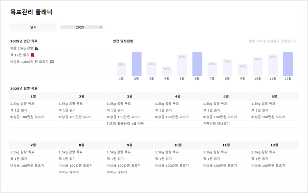 효과적인 목표 설정을 위해서는 연간 목표, 월간 계획, 세부 실행 계획 등을 정리할 수 있는 템플릿이 필요합니다. 한눈에 목표를 확인하고 실천 상황을 점검할 수 있도록 구성된 템플릿을 활용하면 목표 달성 확률이 훨씬 높아집니다.