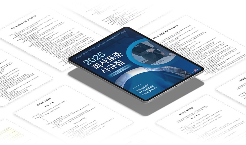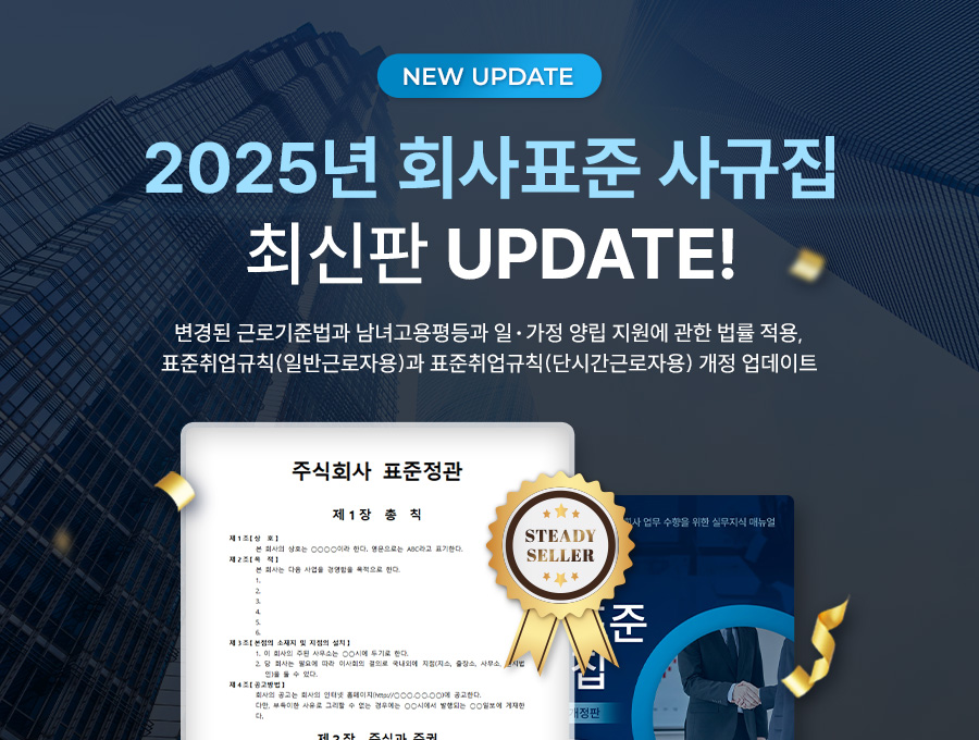 2025년 회사표준 사규집은 근로기준법과 남녀고용평등과 일ㆍ가정 양립 지원에 관한 법률을 바탕으로 표준취업규칙(일반근로자용)과 표준취업규칙(단시간근로자용)을 개정 편집 하였습니다. 신규 회사 규정은 2024년도에 이어서 전체 273개 규정에서 중복규정 2개 삭제, 6개 규정을 증편하였으며, 개정규정은 7건 자료가 수정처리 되었습니다. 또한 신규, 개정 규정을 포함한 별지서식은 704건으로 20건 양식을 증편되었습니다.