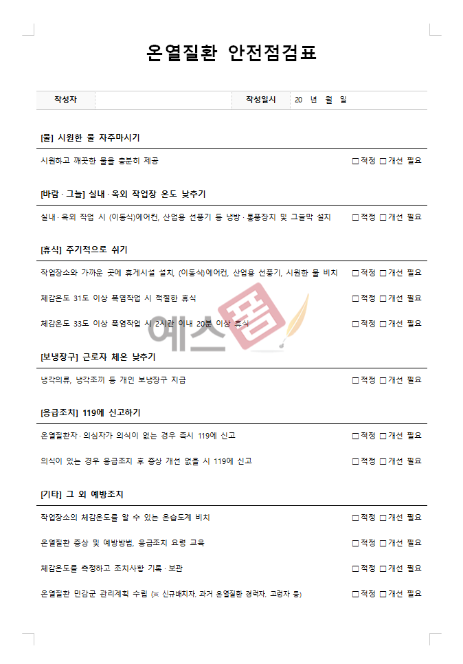 · 안전점검 및 평가: 온열질환 안전점검표, 보호구 지급대장, 안전보건교육일지, 안전보건 자율점검표, 안전점검 실행결과 체크리스트, 협력업체 안전평가서