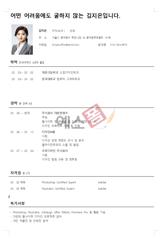 예스폼에서는 단순히 이력서 양식만 제공하는 것이 아닙니다. 각 양식마다 실제 작성 예시와 상세한 가이드라인을 함께 제공하여, 처음 이력서를 작성하는 분들도 쉽게 따라 할 수 있도록 돕고 있습니다.