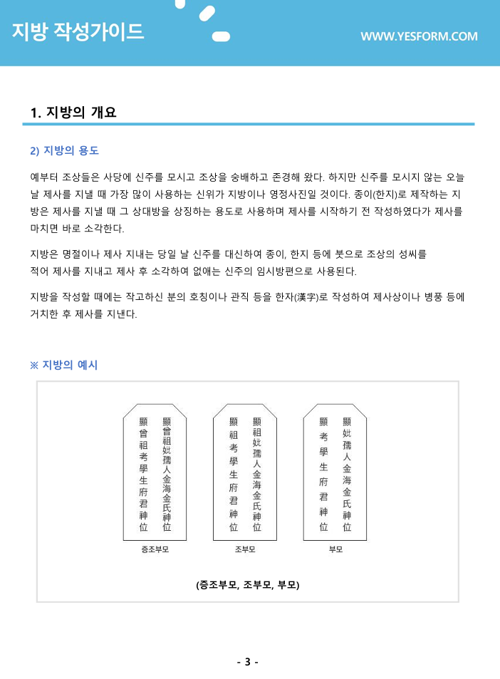 지방의 개요와 신의의 종류, 지방의 구성요소 등으로 구성된 지방 작성가이드입니다. 지방(紙榜)이란 신주, 위패 등을 모시지 않는 현대사회에서 설이나 추석과 같은 명절날 제사를 지낼 때 신