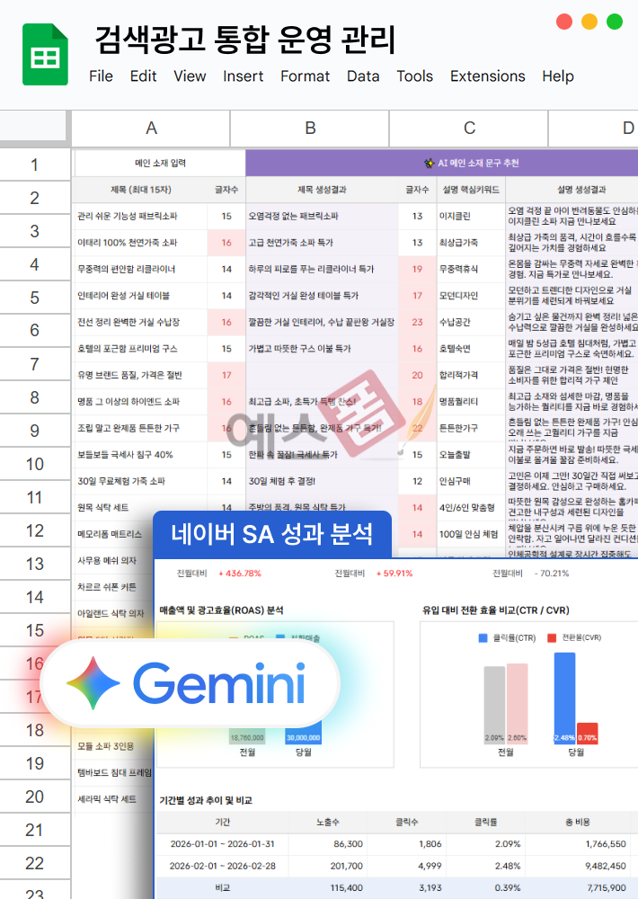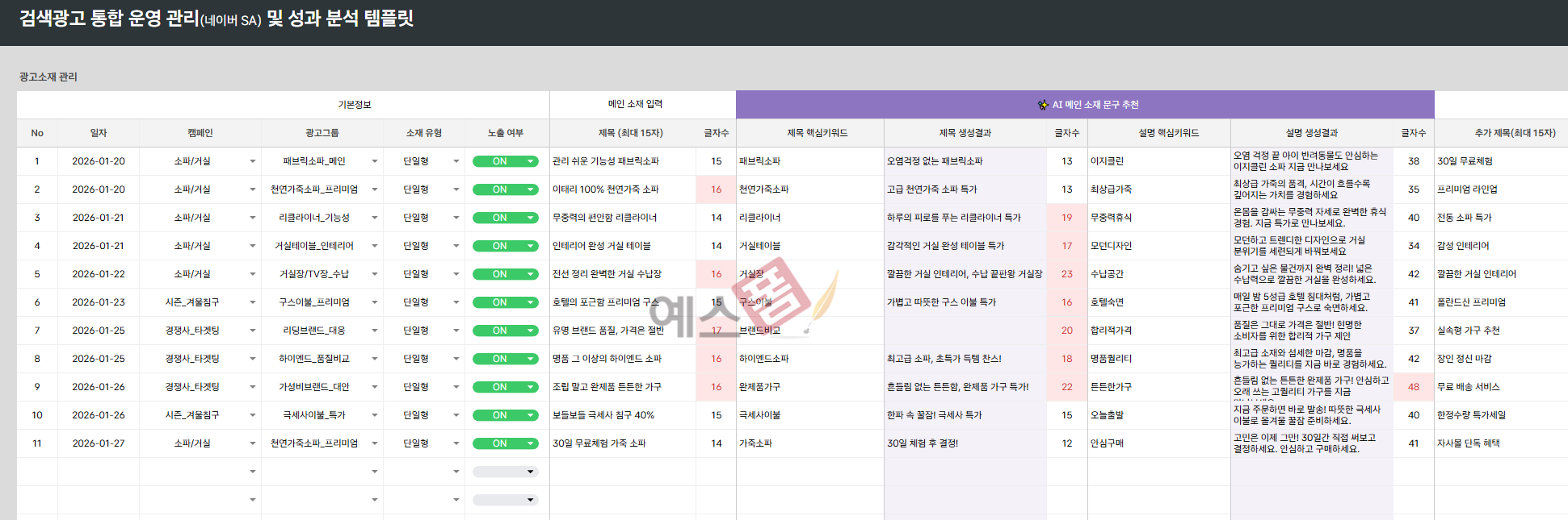 네이버 검색광고(SA) 소재 통합관리 구글시트(AI 소재 문구 자동 생성) 엑셀양식 - 입력만 하면 자