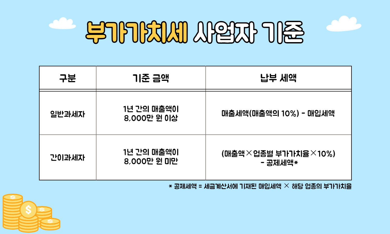 일반과세자와 간이과세자는 매출액을 기준으로 구분하며 1년간의 매출액 8,000만원 이상이면 일반과세자, 미만이면 간이과세자로 구분합니다.