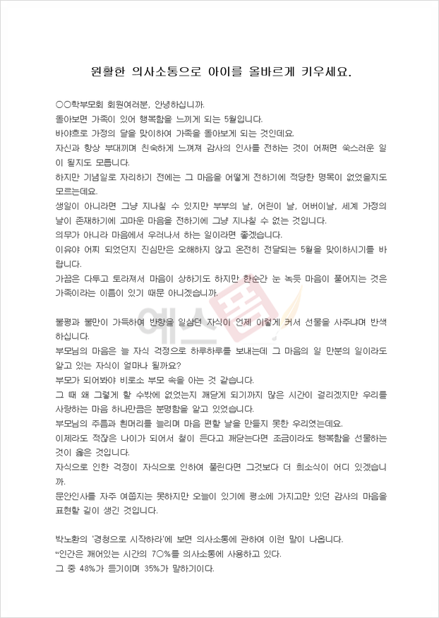 5월 봄인사말 학부모 학부모 어린이날인사말 문서 자료입니다. 원활한 의사소통으로 아이를 올바르게 키우자는 내용의 대표이사의 5월 인사말입니다.