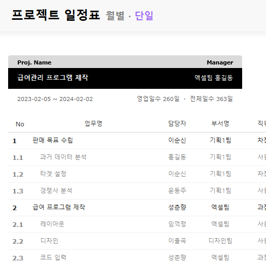 프로젝트 일정표 (주간별) | 프로젝트 일정표 (월별) | 프로젝트 일정표 (분기별) |