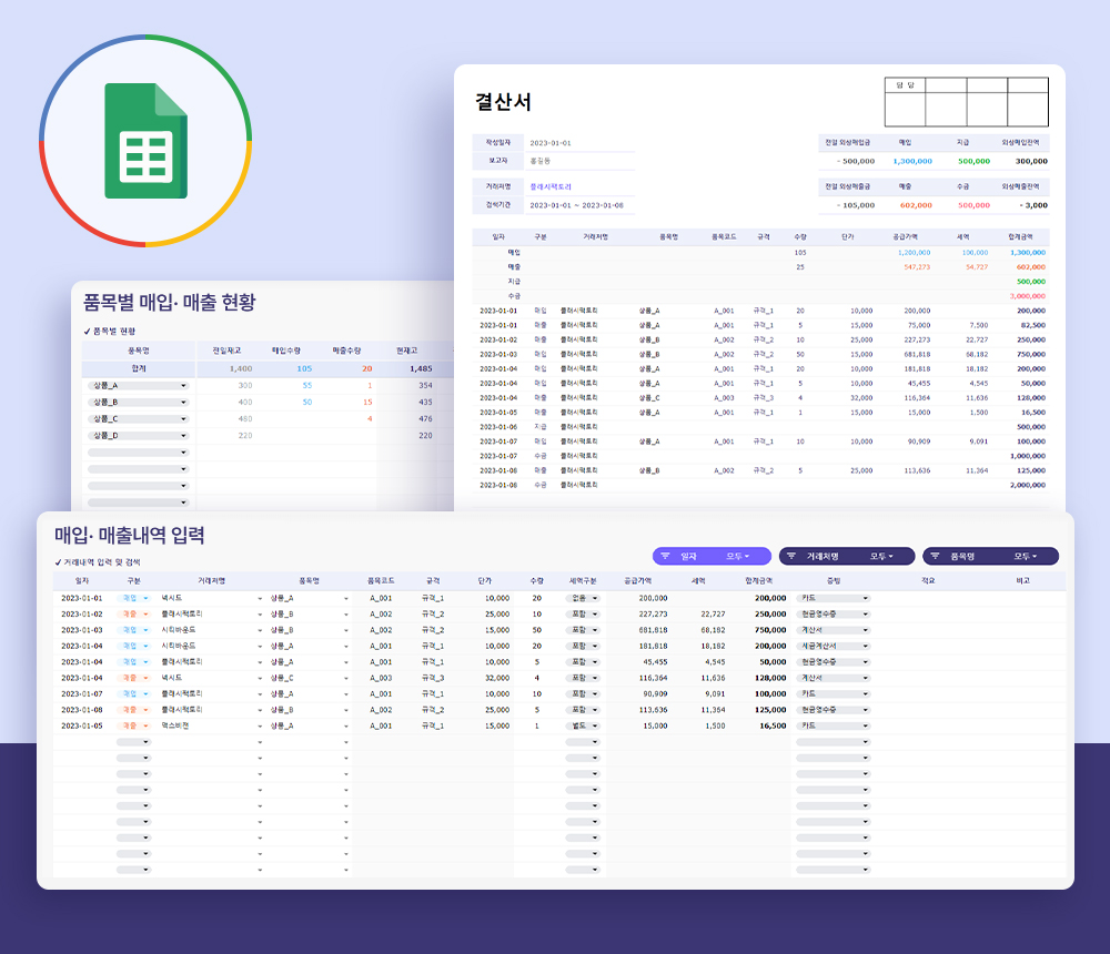 매입(지급) · 매출(수금) 내역 관리와 함께 품목별 재고관리를 할 수 있도록 제작된 구글 스프레드시트입니다. 거래처 · 품목별 거래 · 재고 현황을 확인할 수 있으며 기간, 거래처를 선택 시, 작성된 내용을 바탕으로 결산서 자동작성 기능을 제공합니다.