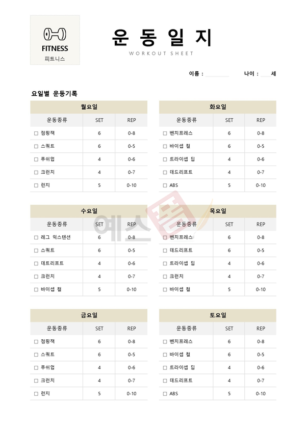 그래도 일단 헬스장에 도착해서 운동을 시작했으면 어떤 부위를 집중적으로 하였는지, 식단은 어떻게 했는지 기록을 해두어야 작심삼일로 그치지 않고 오래도록 효율적으로 운동하실 수가 있는데요. 예스폼에서 서비스하고 있는 다양한 운동일지 양식으로 오운완을 실천해보세요!