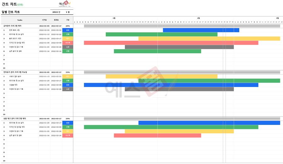 프로젝트 일정관리를 바(bar) 형태의 그래프로 표시한 간트차트 양식입니다.